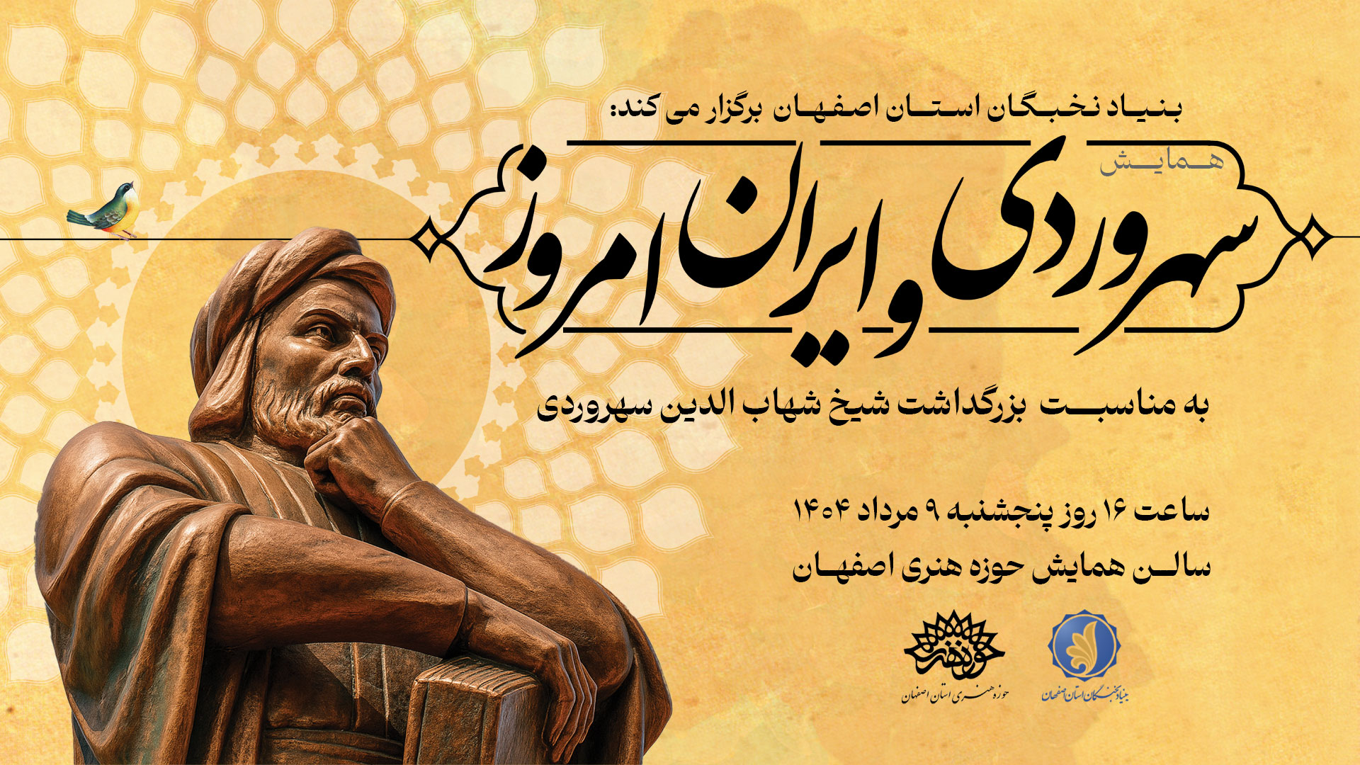 بنیاد نخبگان استان اصفهان به مناسبت بزرگداشت شیخ شهابالدین سهروردی، فیلسوف و عارف نامدار ایرانی، همایشی با عنوان «سهروردی و ایران امروز» برگزار میکند. این رویداد علمی و فرهنگی با حضور جمعی از برجستهترین اندیشمندان، فیلسوفان و پژوهشگران کشور، روز پنجشنبه، نهم مرداد ماه سال جاری، ساعت 16 در سالن همایش حوزه هنری اصفهان برگزار خواهد شد.